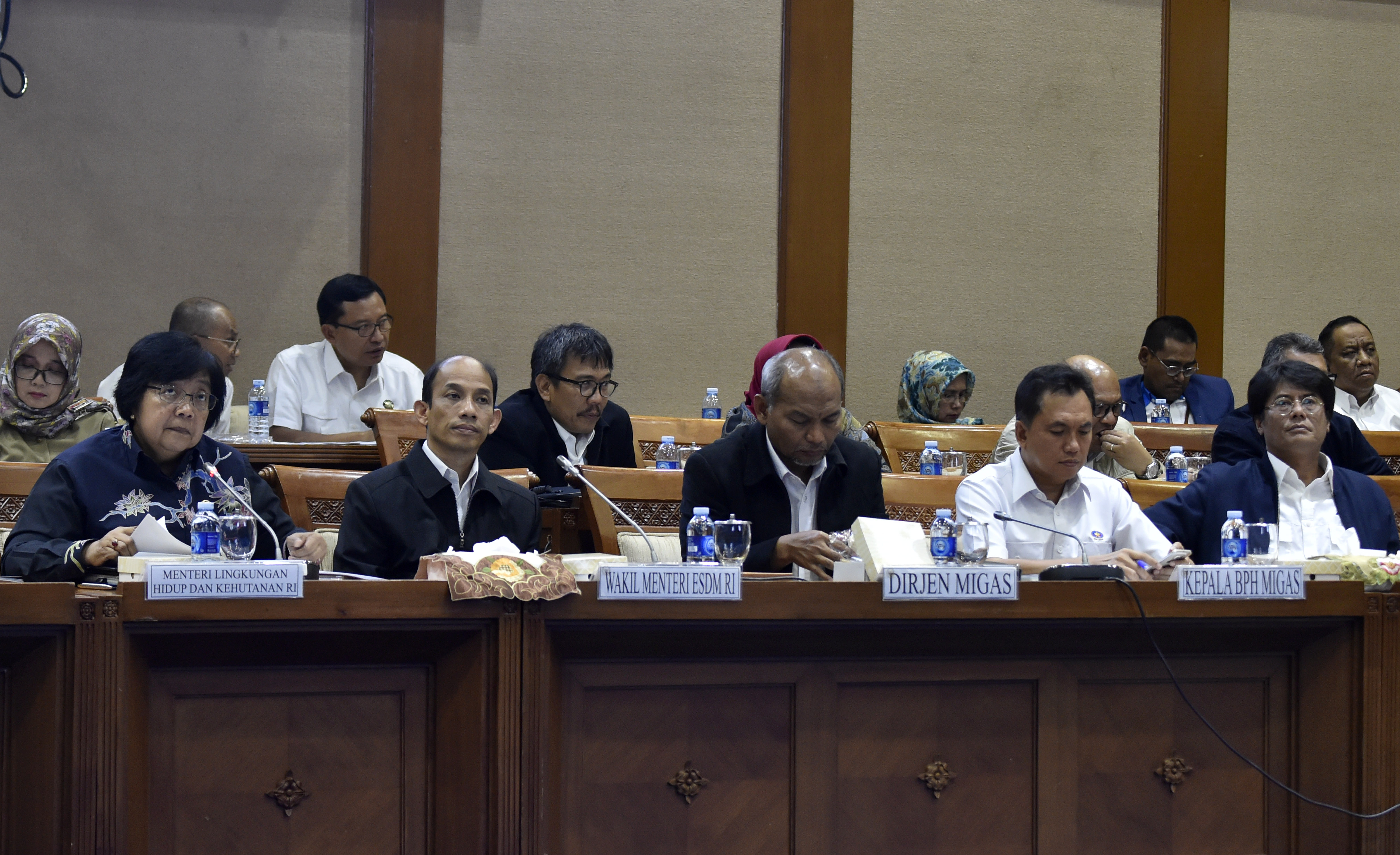 (Dari kiri) Menteri Lingkungan Hidup dan Kehutanan Siti Nurbaya, Wakil Menteri ESDM Arcandra Tahar, Dirjen Migas Djoko Siswanto, Kepala BPH Migas Fanshurullah Asa dan Dirut Pertamina Elia Massa Manik mengikuti rapat kerja terkait upaya penanganan tumpahan minyak Teluk Balikpapan dengan Komisi VII DPR di Kompleks Parlemen Senayan, Jakarta, Senin (16/4). Kementerian LHK memberi sanksi administrasi kepada PT Pertamina (persero) RU V Balikpapan untuk melakukan kajian risiko lingkungan dan audit lingkungan dengan titik berat pada keamanan pipa penyalur minyak, kilang minyak dan sarana pendukung, serta melanjutkan penanggulangan tumpahan minyak dan pemulihan lingkungan akibat kebocoran pipa.