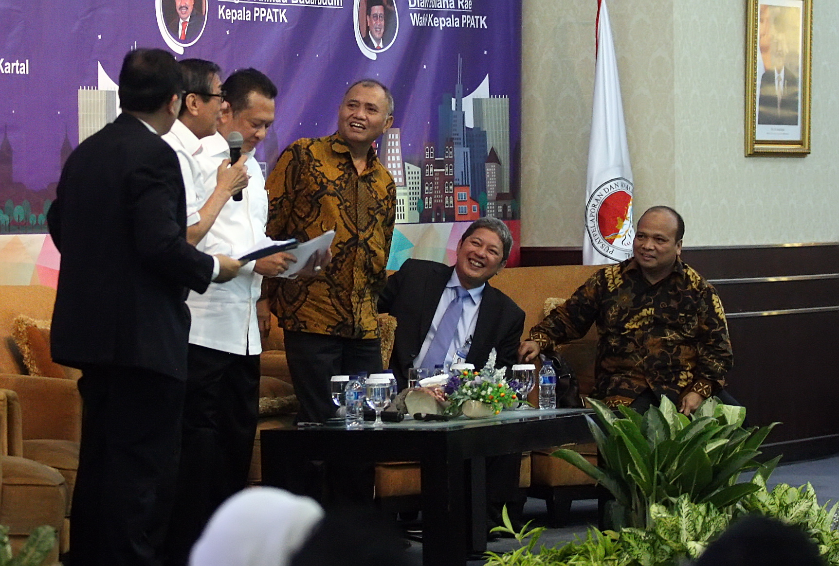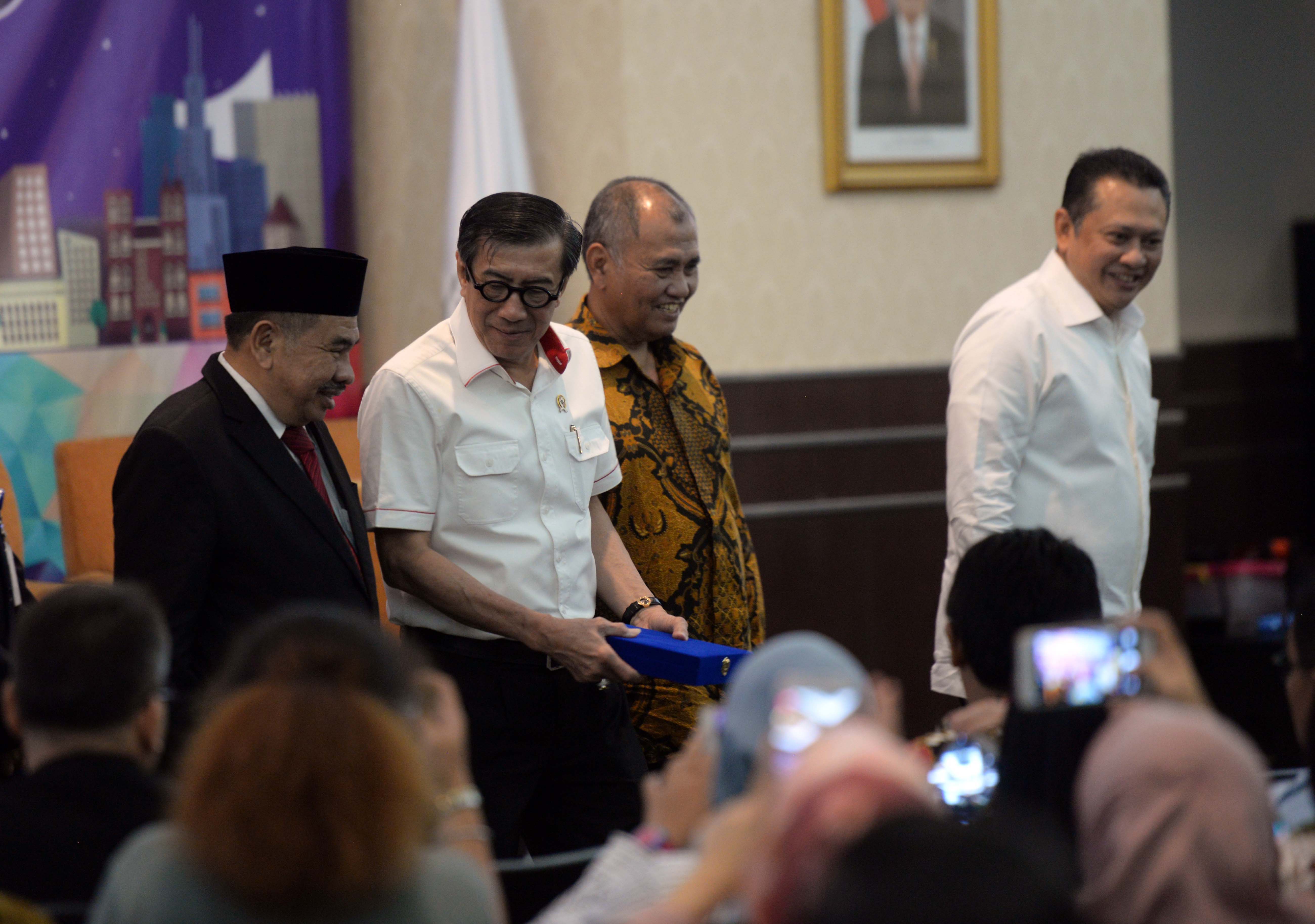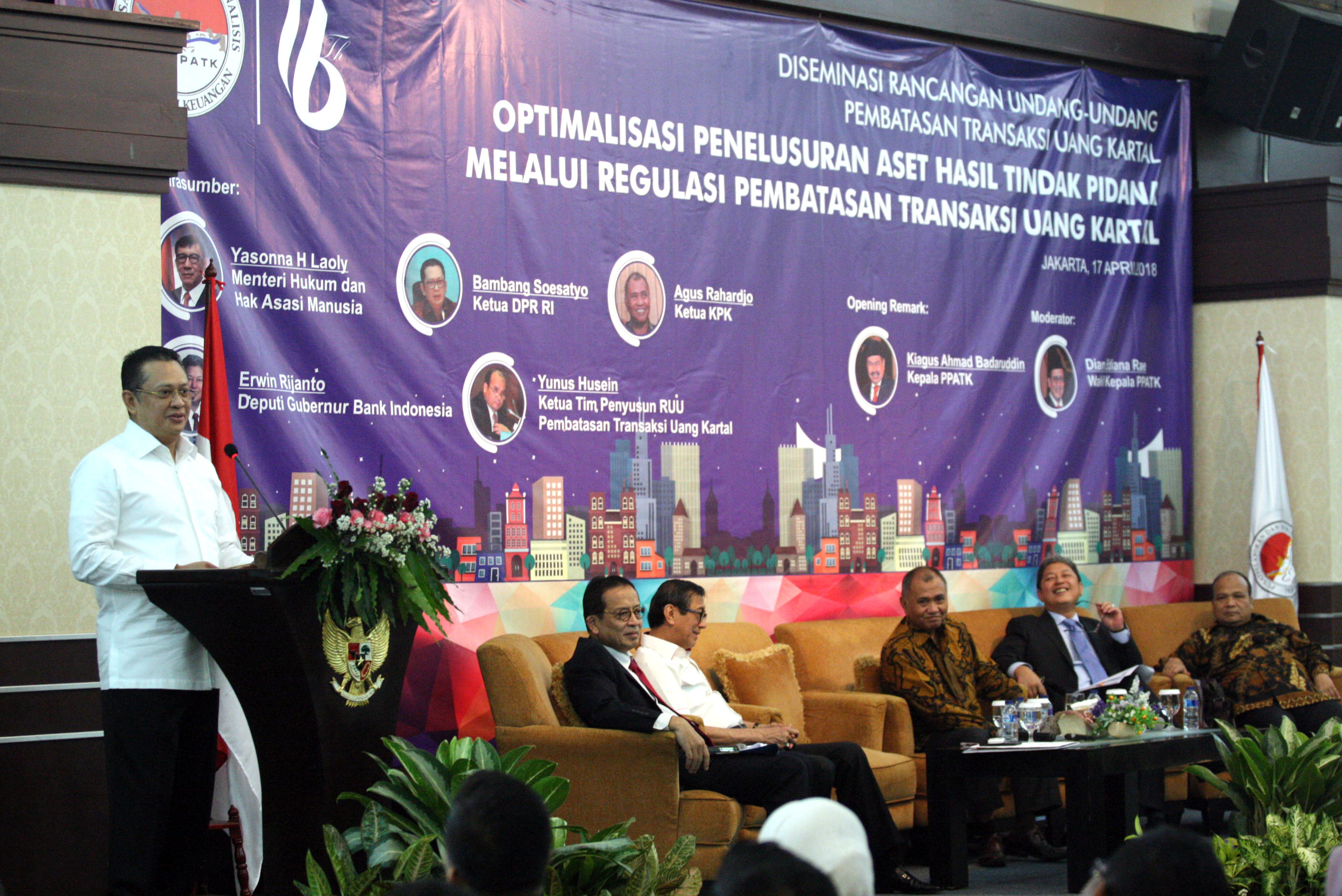 Dari kiri Ketua DPR RI Bambang Soesatyo, moderator Dian Ediana, Menkumham Yasonna Laoly, Ketua KPK Agus Rahardjo, Deputi gubernur BI Erwin Rijanto, dan Kepala PPATK Periode 2002-2006 Yunus Husein, di acara Diseminasi RUU Pembatasan Transaksi Uang Kartal di PPATK, Jakarta, Selasa (17/4). Saat ini draft Rancangan Undang Undang Pembatasan transaksi uang kartal sudah dalam tahap final.