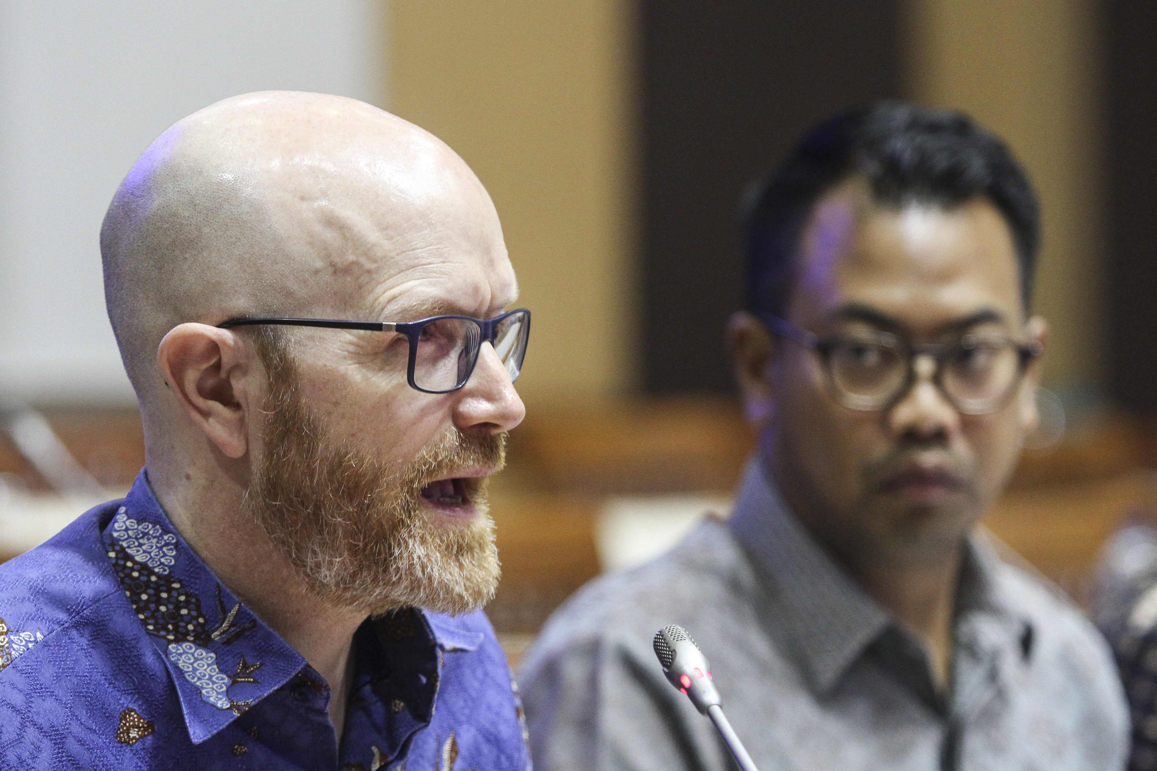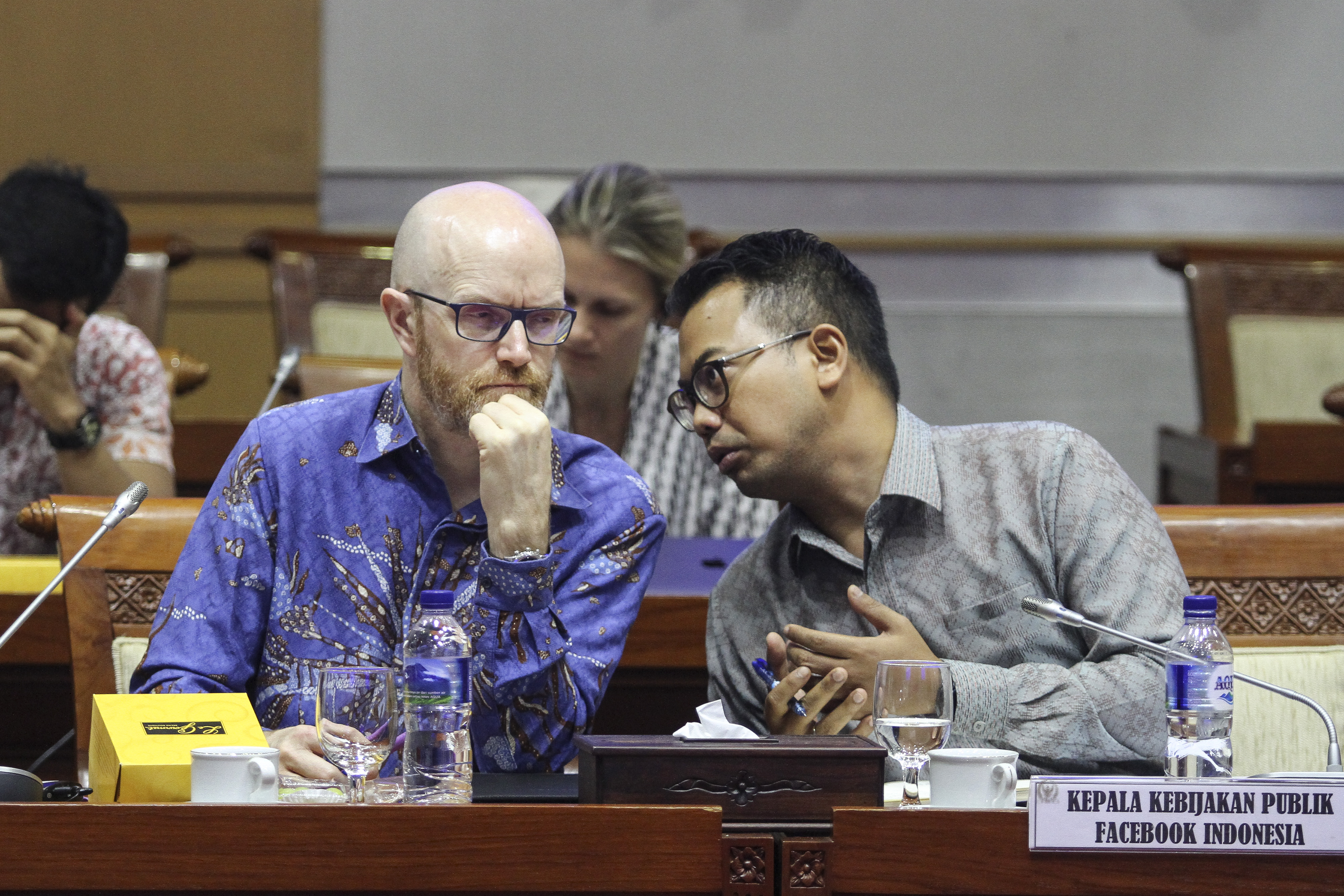 Vice President and Public Policy Facebook Asia Pacific Simon Milner (kanan) mengikuti rapat dengar pendapat umum dengan Komisi I DPR di Kompleks Parlemen Senayan, Jakarta, Selasa (17/4). Rapat ini membahas bocornya satu juta lebih data pengguna Facebook di Indonesia. ANTARA FOTO/Dhemas Reviyanto
