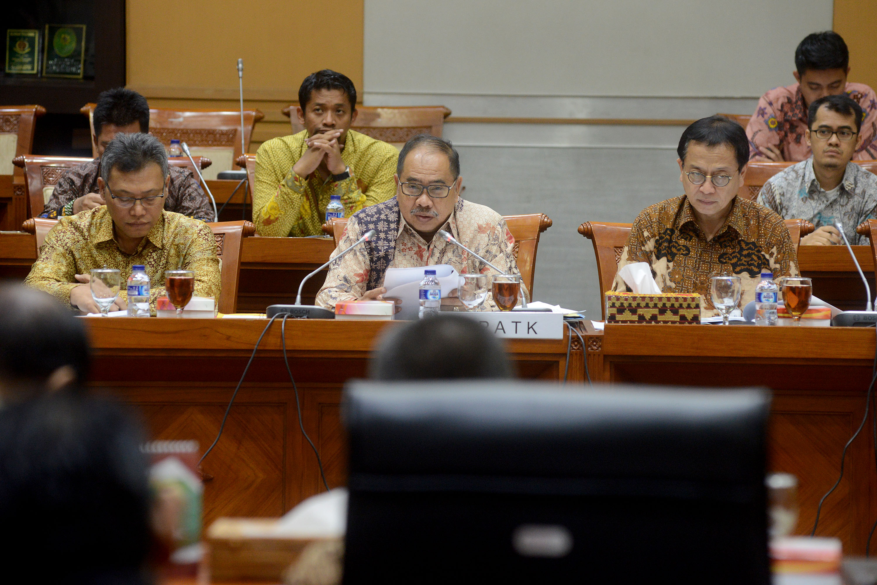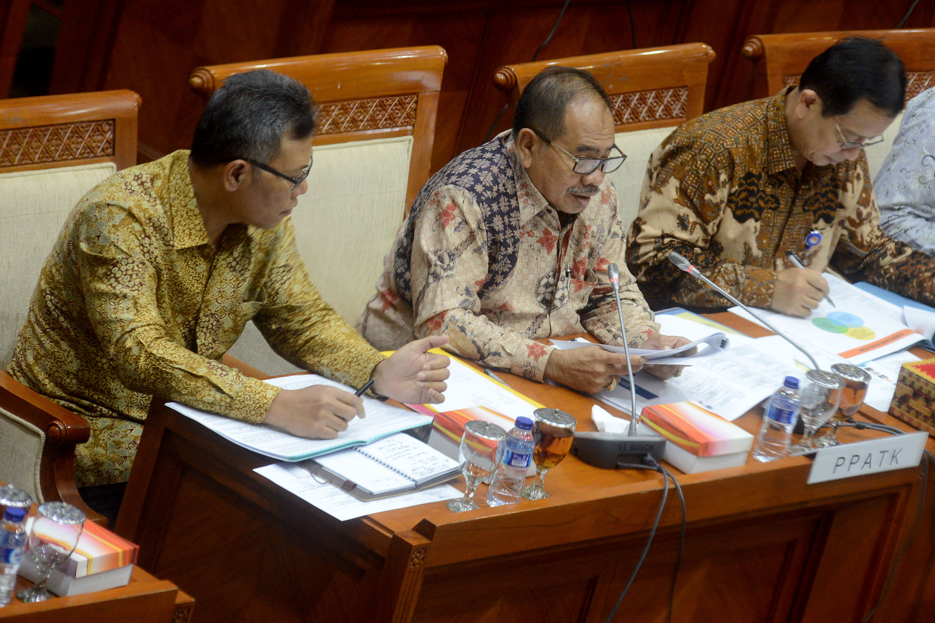Kepala Pusat Pelaporan dan Analisis Transaksi Keuangan (PPATK) Kiagus Ahmad Badaruddin (tengah) didampingi Wakil Kepala PPATK Dian Ediana Rae (kanan) dan Deputi Bidang Pencegahan PPATK Muhammad Sigit menyampaikan pemaparan dalam rapat kerja dengan Komisi III DPR di Gedung Nusantara II, Kompleks Parlemen Senayana, Jakarta, Rabu (18/4). Rapat tersebut membahas persoalan aliran dana narkoba, terorisme, transaksi mencurigakan terkait korupsi dan dugaan aliran dana mencurigakan dari dan ke bakal calon kepala daerah dan bakal calon wakil kepala daerah dalam kontestasi Pilkada 2018.