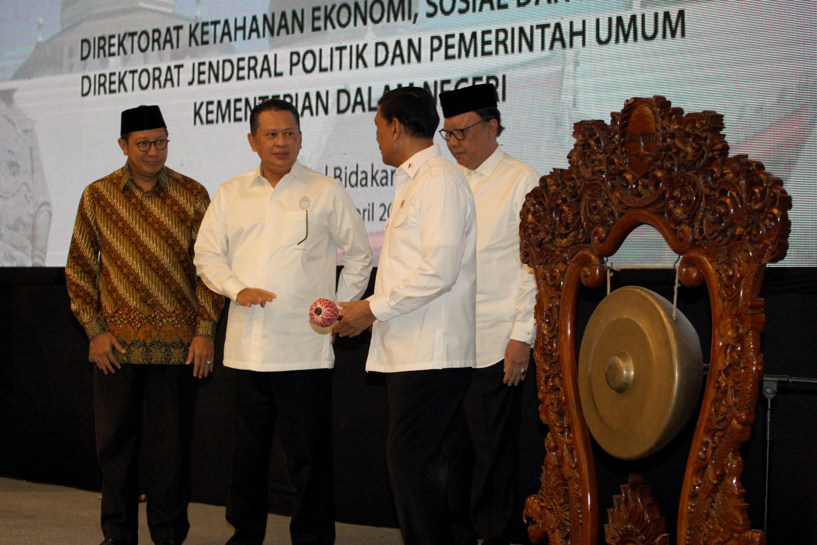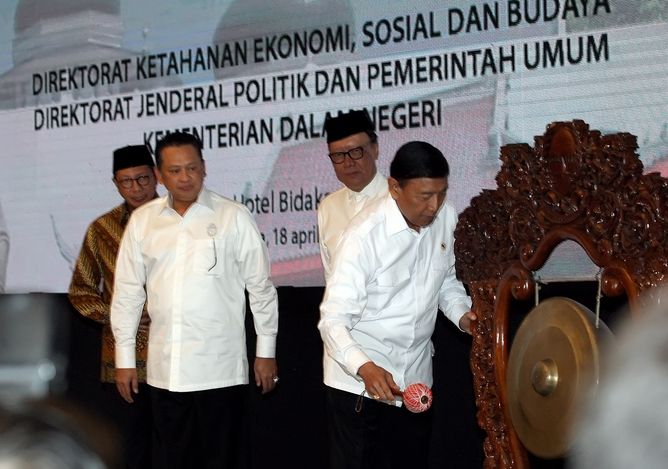 Menko Polhukam Wiranto, bersama Mendagri Tjahjo Kumolo, Menteri Agama Lukman Hakim Saifuddin, dan Ketua DPR Bambang Soesatyo, saat membuka Rapat Koordinasi Nasional (Rakornas) Forum Kerukunan Umat Beragama (FKUB) di Jakarta, Rabu, (18/4). Mendagri Tjahjo Kumolo dan Menko Polhukam Wiranto meminta forum ini dapat menjaga harmoni kebangsaan demi menyukseskan pesta demokrasi.
